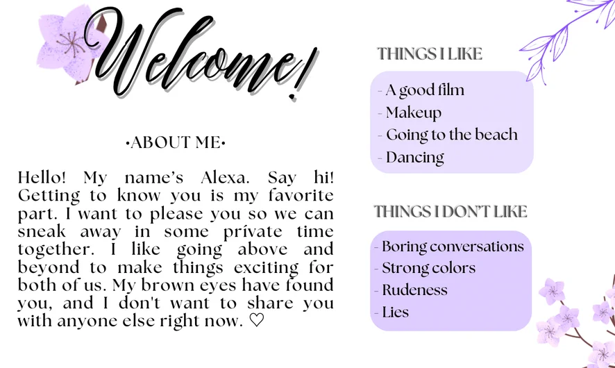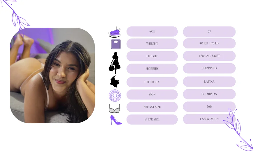 Zabawki, Masaż, Taniec erotyczny, Camel toe, Robienie loda, Pokaz w oliwie, Twerking, Topless, Klapsy, Palcówka, Dildo lub wibrator, Striptiz, Głębokie gardło, Tittyfuck, Orgazm, Anal, Wytrysk w środku, Fetysz stóp, Odgrywanie ról, Kobiecy wytrysk, Masturbacja, Wytrysk, Na pieska, Masturbacja, Kowbojka